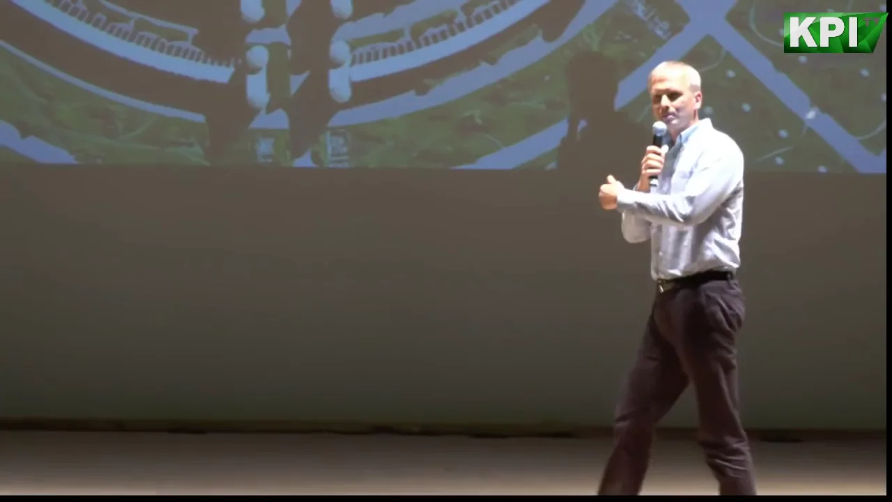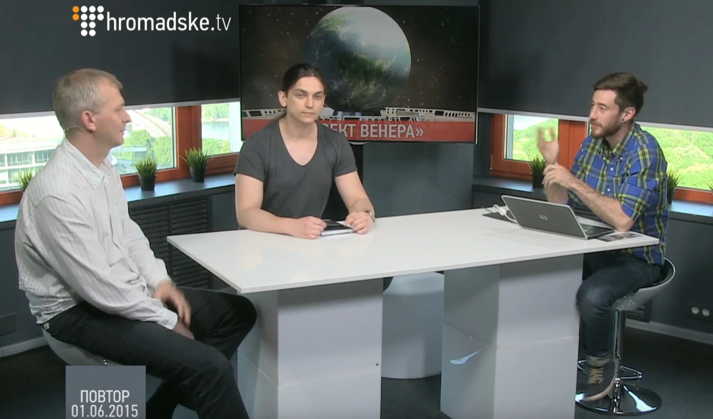 Andrey spoke at the Kyiv Polytechnic Institute – at that time my team and I managed to gather 1,700 people in record time for the premiere of the movie “The Choice is Ours”, with a live broadcast with Jacque Fresco. That was in 2015. We also did an interview with him on Hromadske (see photo below).